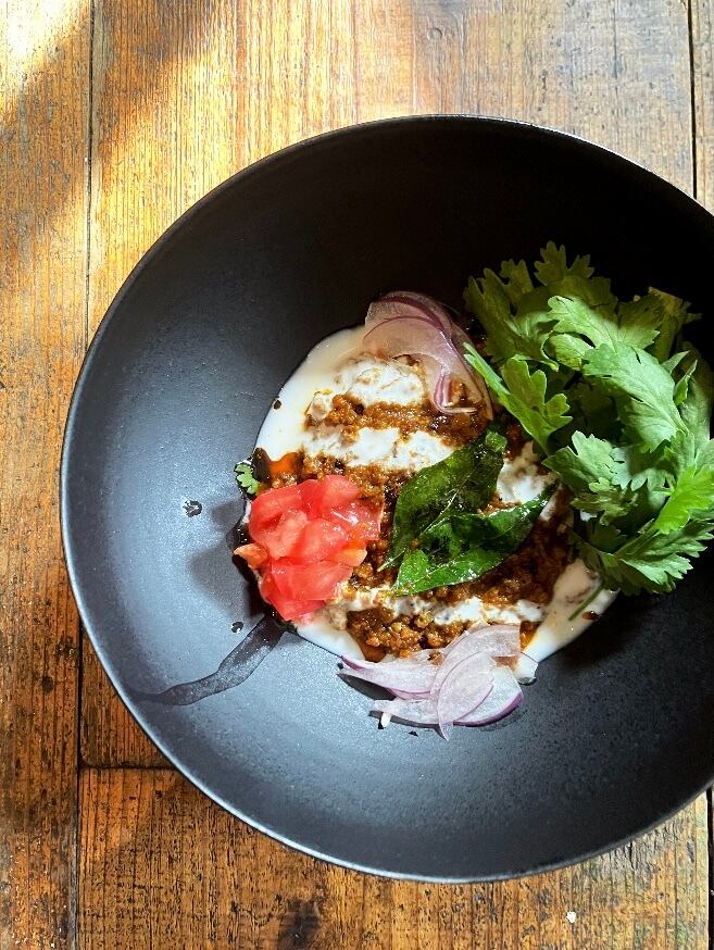 玉ねぎを丁寧に優しく炒め、野菜の旨味コクを大切にし、10種類のスパイスとラム挽肉を使用した少し辛めのスパイシーなキーマカレーです。